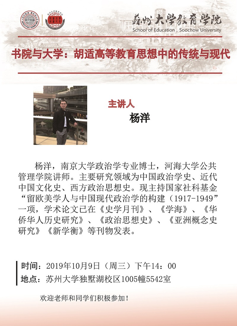 学术报告:书院与大学:胡适高等教育思想中的传统与现代[10.9]