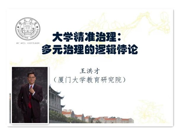 王洪才教授从“一放就乱,一收就死”怪圈、“重科研—轻教学”现象、“破五唯”怎么破等大学治理的现实问题出发,探讨大学多元治理与精准治理的关系。他从“大学治理呼唤多元参与”“大学现实状况需要精准治理”“大学精准治理对抗多元参与”“多元治理和精准治理调和”四个方面进行深入详细论述。王教授认为,精准治理和多元参与存在精英逻辑和市场逻辑的对立。多元治理是长期发展目标,是一种结构化趋势;精英治理是现实发展需求,是一种激励工具。两者之间是目的与手段、结构与过程的冲突。最后,他总结认为:大学治理的长期目标是建立一种共同治理结构,多元参与是基本目标;大学现实发展需要实行精准治理,努力实现对学术自由权力的法律保护;完善的法制建设是推进大学多元参与治理和实现精准治理的保障。