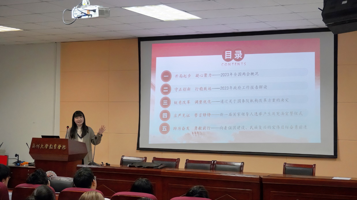 为突出“精准思政”育人理念,夯实“主题班会”育人阵地,深入“青年心”,做好青年学生的“知心人”、“引路人”,2023年4月26日18:30,苏州大学教育学院辅导员苏兴亚面向教育学院本科生开展“青听两会”主题班会。