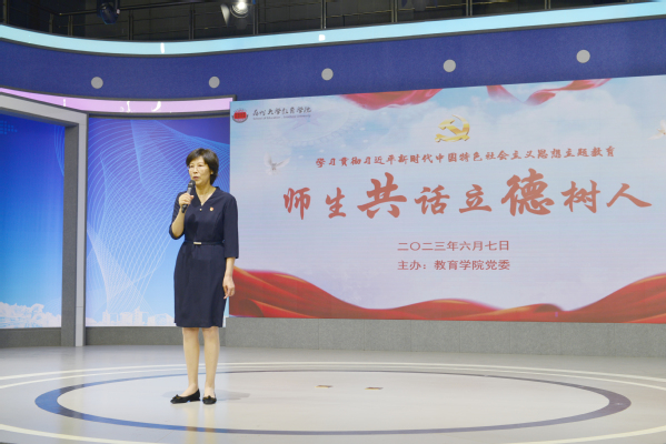 学院党委书记赵阳在致辞中表示,学习贯彻习近平新时代中国特色社会主义思想主题教育开展以来,教育学院党委把“学思想、强党性、重实践、建新功”的总要求贯穿于主题教育始终,把主题教育同落实立德树人根本任务,践行为党育人、为国育才教育初心,服务中华民族伟大复兴重要使命紧密结合起来。“师生共话立德树人”活动也是主题教育的一项重要内容,由学院党委和教育专家共同策划,师生一起参与,共同讲述教育名家的故事,围绕立德树人的深刻内涵和现实要求进行问答讨论,希望通过主题教育激励广大师生切实把主题教育的成效转化为教育事业作贡献的强大动力和实际行动,在新时代的赶考路上共同答好立德树人的时代答卷。