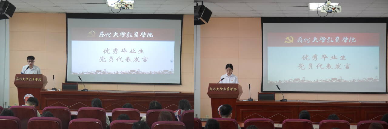优秀毕业生代表发言环节,本科生代表林江涛和研究生代表陈昊璇先后分享了自己在校期间的成长经历和感悟。林江涛回顾了自己在学习、科研、学生工作和社会实践中的点点滴滴,表达了对学院领导和老师的感激之情。他鼓励同学们要始终保持积极向上的心态,勇于面对挑战,在奋斗中绽放青春的光彩。陈昊璇结合个人研究生学习和科研经历,分享了自己在学术和实践道路上不断探索和创新的过程。他们表示,作为毕业生党员,将始终牢记党的教诲,在未来的学习和工作中发挥先锋模范作用,以实际行动为党和国家的事业贡献力量。