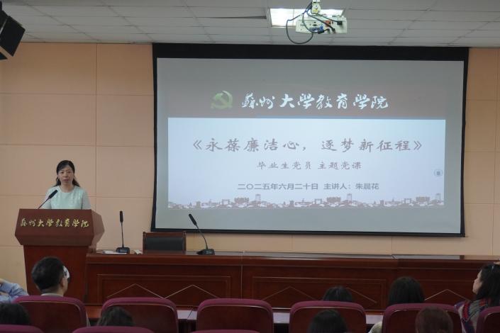 为进一步增强毕业生党员的党性修养和廉洁意识,引导他们在新的人生征程上坚守初心、勇担使命,6月20日下午,苏州大学教育学院召开了“清风启航,逐梦山海”毕业生党员大会。教育学院党建办公室全体成员、全体毕业生党员参加了本次大会,会议由本科生辅导员苏兴亚主持。
