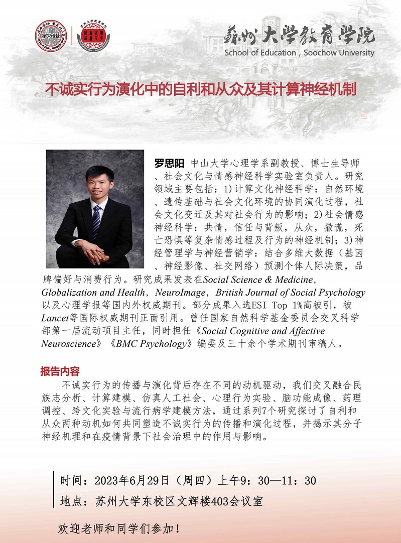 学术报告:不诚实行为演化中的自利和从众及其计算神经机制[6.29]