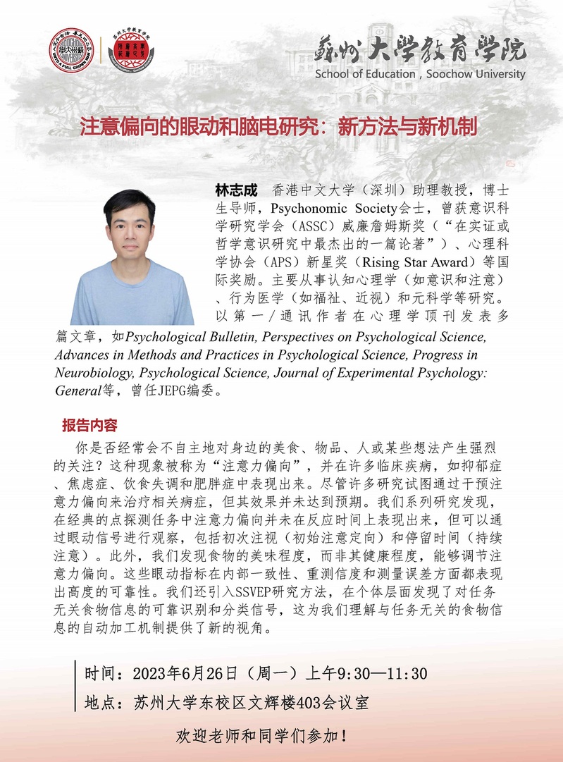 学术报告:注意偏向的眼动和脑电研究:新方法与新机制[6.26]
