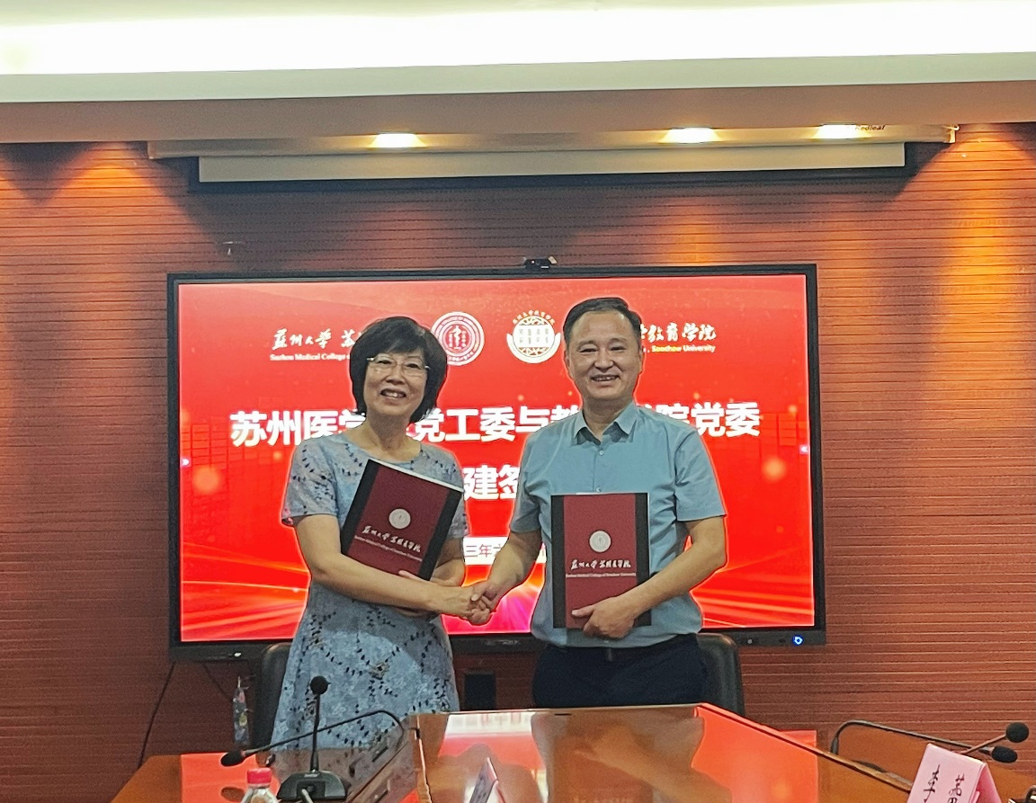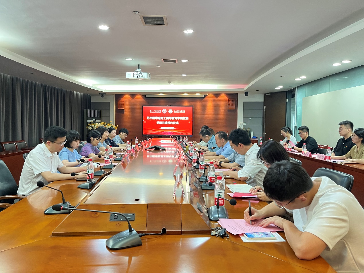 为推动学习贯彻习近平新时代中国特色社会主义思想走深走实 ,推进党的理论创新实践创新,促进党建与业务深度融合,2023年6月29日上午,苏州医学院党工委与教育学院党委举行党建共建签约仪式。教育学院党委书记赵阳,副书记、副院长朱晨花,专职组织员常静,团委书记张旻蕊,心理学系支部书记黄建平,研究生专职辅导员乔方毅;苏州医学院党工委书记钱福良,副书记吴德建,副书记、副院长孟玲玲,专职组织员朱尧兴,研究生专职辅导员陈玲、舒鹏、李蕾、余书敏、陆政廷、李琪、周丹丹、霍俊龙、娄勇、石泉泉、陆菲出席会议。会议由吴德建主持。