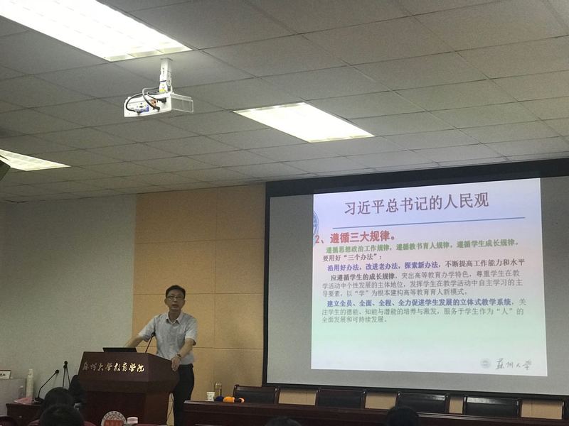 为深入学习贯彻习近平新时代中国特色社会主义思想,全面贯彻党的教育方针,落实立德树人根本任务,加强社会主义核心价值观教育,积极响应全校上下“学习新思想,改革再出发,开放迈新步,发展高质量”解放思想大讨论活动,教育学院和马克思主义学院党委于2018年6月20日上午9时在教育学院报告厅联合举办“学习新思想千万师生同上一堂课”活动,共同学习宣传贯彻习近平总书记在北京大学师座谈会上和纪念马克思诞辰200周年大会上重要讲话精神。本次活动由教育学院党委书记蒋晓虹主持。