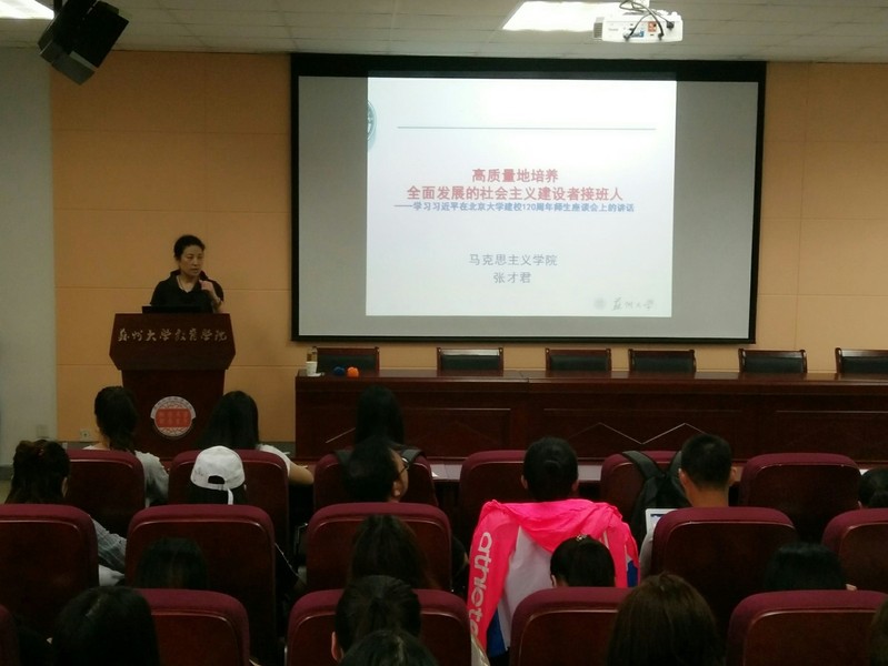 马克思主义学院党委书记张才君以《高质量地培养全面发展的社会主义建设者接班人》为题为两院师生讲授党课,他从七个方面详细解读了十九大报告对人民观的主要论述,指出习近平新时代中国特色社会主义思想中的一个重要理念是以人民为中心的思想,中国特色社会主义人民观体现在人民主体、人民位置、人民立场和人民生活四个方面。张书记认为高校重要的办学职责就是服务学生,高校高质量地培养全面发展的社会主义建设者和接班人需要坚持办学正确的政治方向,遵循思想政治工作、教书育人、学生成长的三大规律;加强师资队伍建设,完善人才培养体系,提升学生素养。最后,张书记希望青年学生能做到“铜头,铁嘴,橡皮肚子,飞毛腿”:提高政治素养,良好表达和沟通,胸怀宽广,勤于思考和行动。