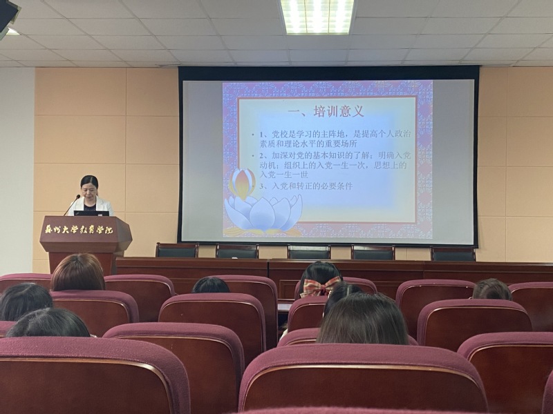 2020年10月15日,教育学院分党校第36期培训班开班典礼在教育学院学术报告厅举行。院党委书记赵阳、党委副书记、副院长朱晨花出席了开班典礼,学院54名预备党员和入党积极分子参加了本次培训。