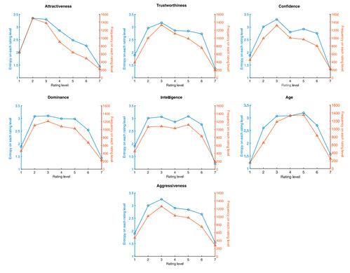 图二. 7类面孔特征判断中各评分的频率分布(红线)和转移概率矩阵在各评分状态的信息熵变化(蓝线)。信息熵变化的分布与各评分状态的频率分布相似。转移概率矩阵信息熵的变化分布亦可证明序列相依性。