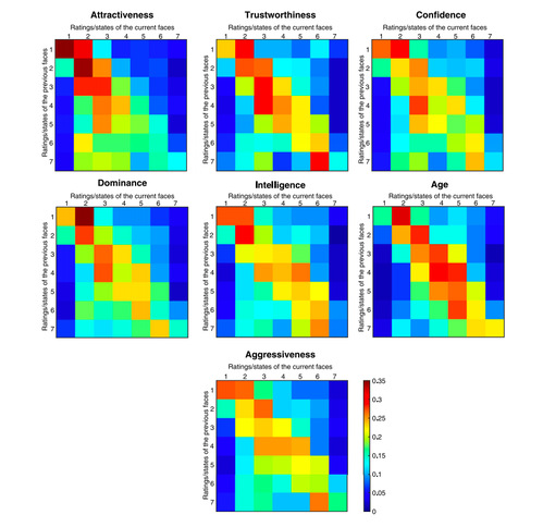 图一. 七种面孔社会特征的转移概率矩阵。矩阵中每个网格的颜色代表从先前判断反应(x轴)到当前判断反应(y轴)的转移概率。高转移概率更红,低转移概率更蓝。