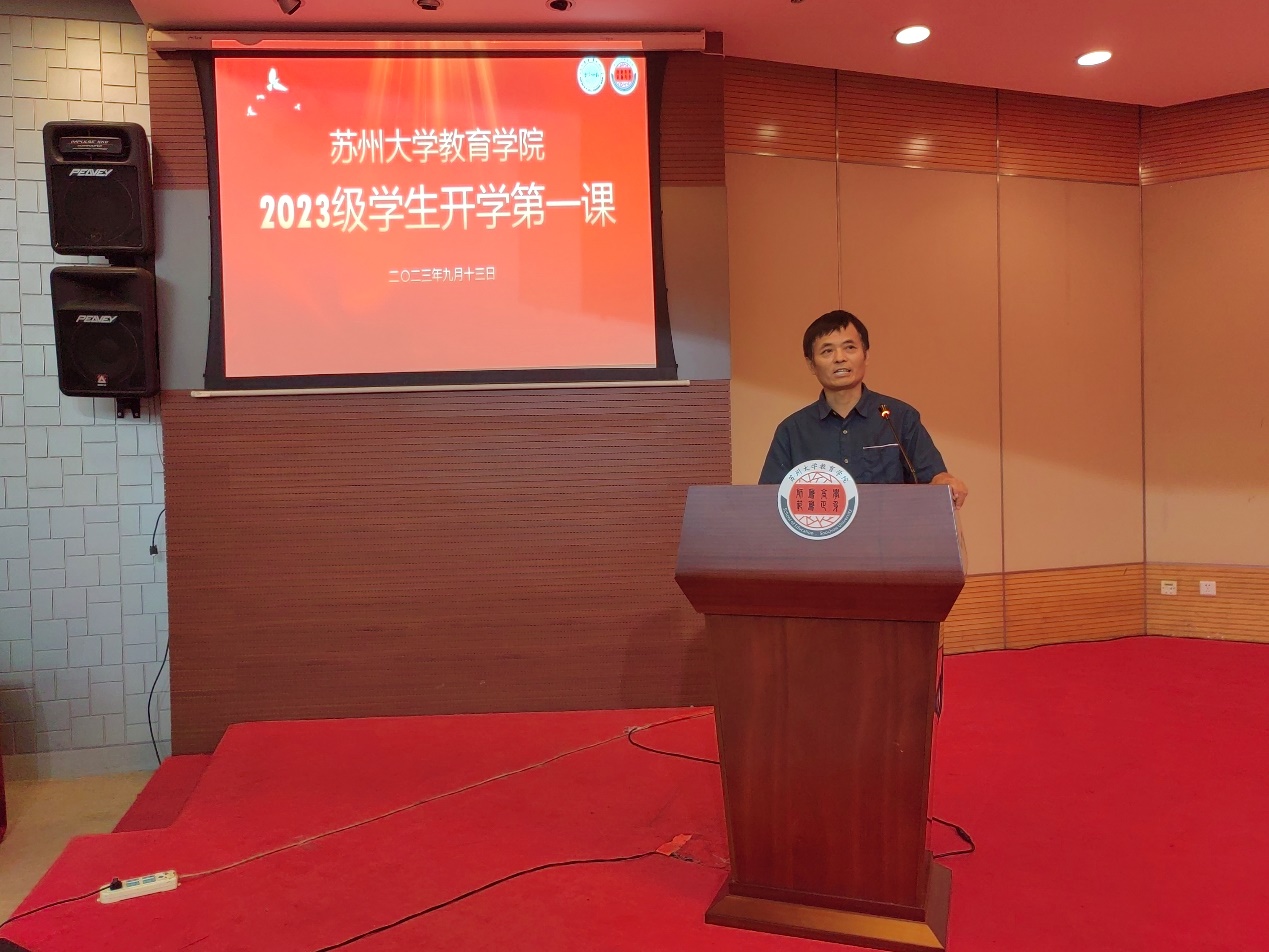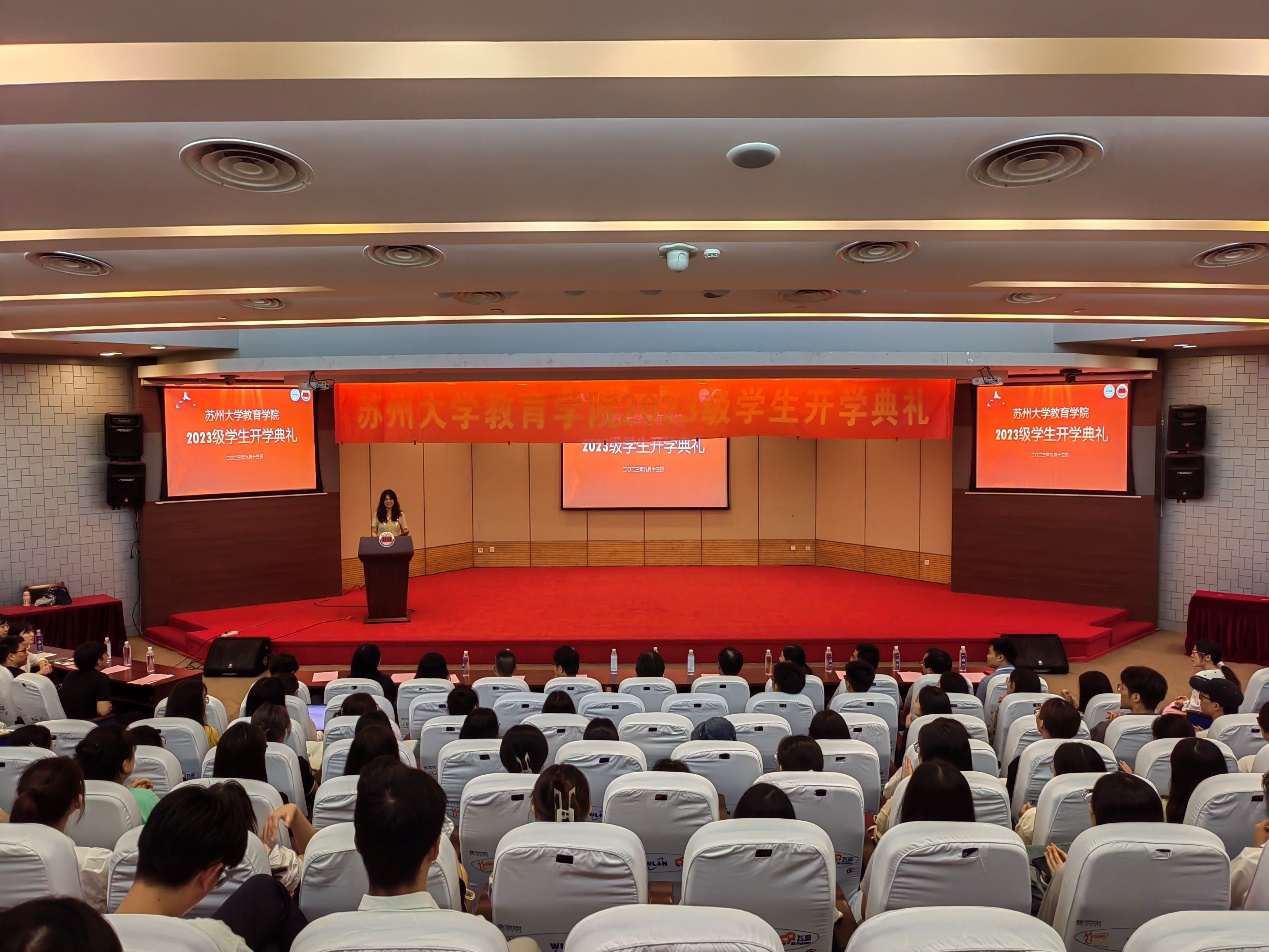 2023年9月13日晚18:30,苏州大学教育学院2023级学生开学典礼在苏州大学独墅湖校区炳麟图书馆学术报告厅举行。教育学院党委书记赵阳,院长冯成志,副院长曹永国、冯文锋,党委副书记、副院长朱晨花,副处职组织员常静,院长助理王一涛、付亦宁,党委委员、心理学系主任周成军,教育学系系主任、教育学系教工党支部书记余庆,教育技术学系主任秦炜炜,心理学系教工党支部书记黄建平,2023级新生班主任顾秀林、徐鑫,学生工作办公室主任、本科生辅导员钱成一,团委书记、研究生辅导员张旻蕊,本科生辅导员苏兴亚,研究生辅导员乔方毅,2023级全体新生出席了本次开学典礼,开学典礼由2022级研究生钟思雨主持。