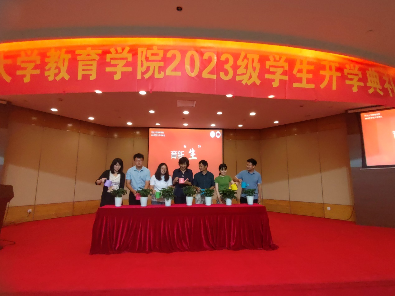 薪火相传,生生不息,教育学院用陪伴与爱育新“生”。赵阳书记、冯成志院长、支部书记代表付亦宁老师、班主任代表顾秀林老师与博士生新生代表胡迪、硕士生新生代表何雨璇、本科生新生代表张兆钰共同浇灌幸福之树,共育新“生”,开启无限可能的成长之途。
