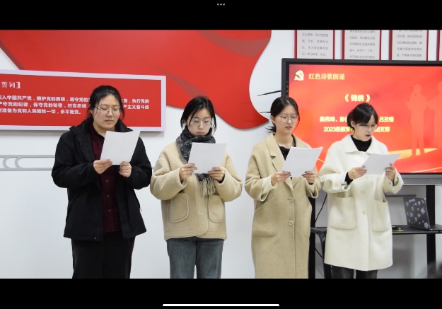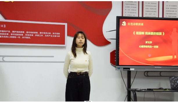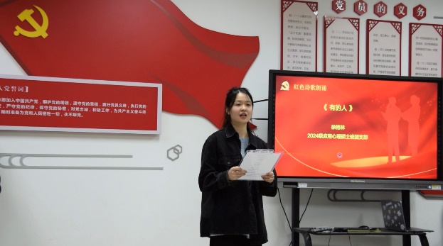 活动正式开启后,红色经典朗诵成为首个亮点。来自不同支部的朗诵者们深情演绎了《我的南方和北方》、《有的人》、《可爱的中国》等经典诗篇,表达了对党和祖国的无限热爱。朗诵者们的声音时而低沉有力,时而激昂高亢,他们的朗诵深情而富有感染力,仿佛带领听众穿越时空的长河,回到了那些烽火连天的革命岁月,深切感受到了革命先辈们坚定的理想信念和不屈不挠的斗争精神。在他们的朗诵中,听众仿佛能够触摸到历史的脉搏,感受到革命精神的传承与发扬。