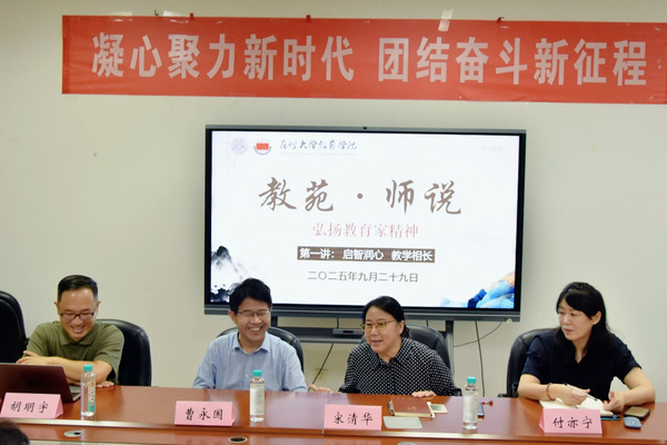 2025年9月29日下午,教育学院党委在学院1005-5542研讨室举行《教苑・师说》活动启动仪式,并开展第一讲“启智润心教学相长”。活动由学院教学副院长曹永国主持,学院党委书记宋清华、受邀教授专家及青年教师代表参会。