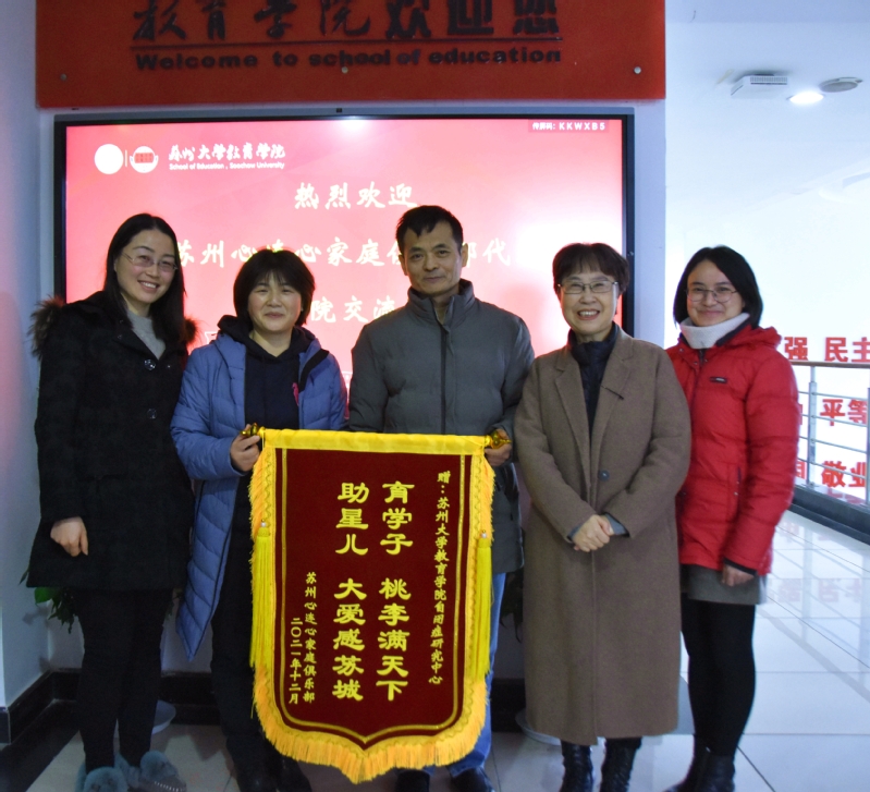 2022年1月8日下午苏州心连心家庭俱乐部代表一行三人来学院交流并赠锦旗,冯成志院长、刘电芝教授和疏德明老师参与了座谈。苏州心连心家庭俱乐部是由苏州市400多名自闭症家长组成的公益组织,三位代表对刘电芝教授领衔的苏州大学教育学院自闭症研究中心多年来坚持开展自闭症儿童团体干预训练公益项目表达了衷心感谢,为参加训练儿童的症状改善与成长进步感到欣喜。冯成志院长对自闭症研究中心长期坚持开展自闭症儿童干预公益活动进行了充分肯定,表示学院将继续支持此项公益活动的开展,让更多自闭症儿童及家庭受益,并推动相关领域的理论和应用研究。
