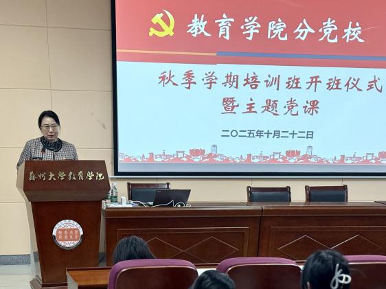 2025年10月22日,苏州大学教育学院分党校秋季学期培训班开班仪式暨主题党课在庄严而热烈的氛围中拉开帷幕。学院党委书记宋清华、副处级组织员常静出席本次开班仪式,分党校入党积极分子、发展对象及预备党员学员参加了本次培训。开班仪式由本科生辅导员、本科生党支部书记苏兴亚主持。