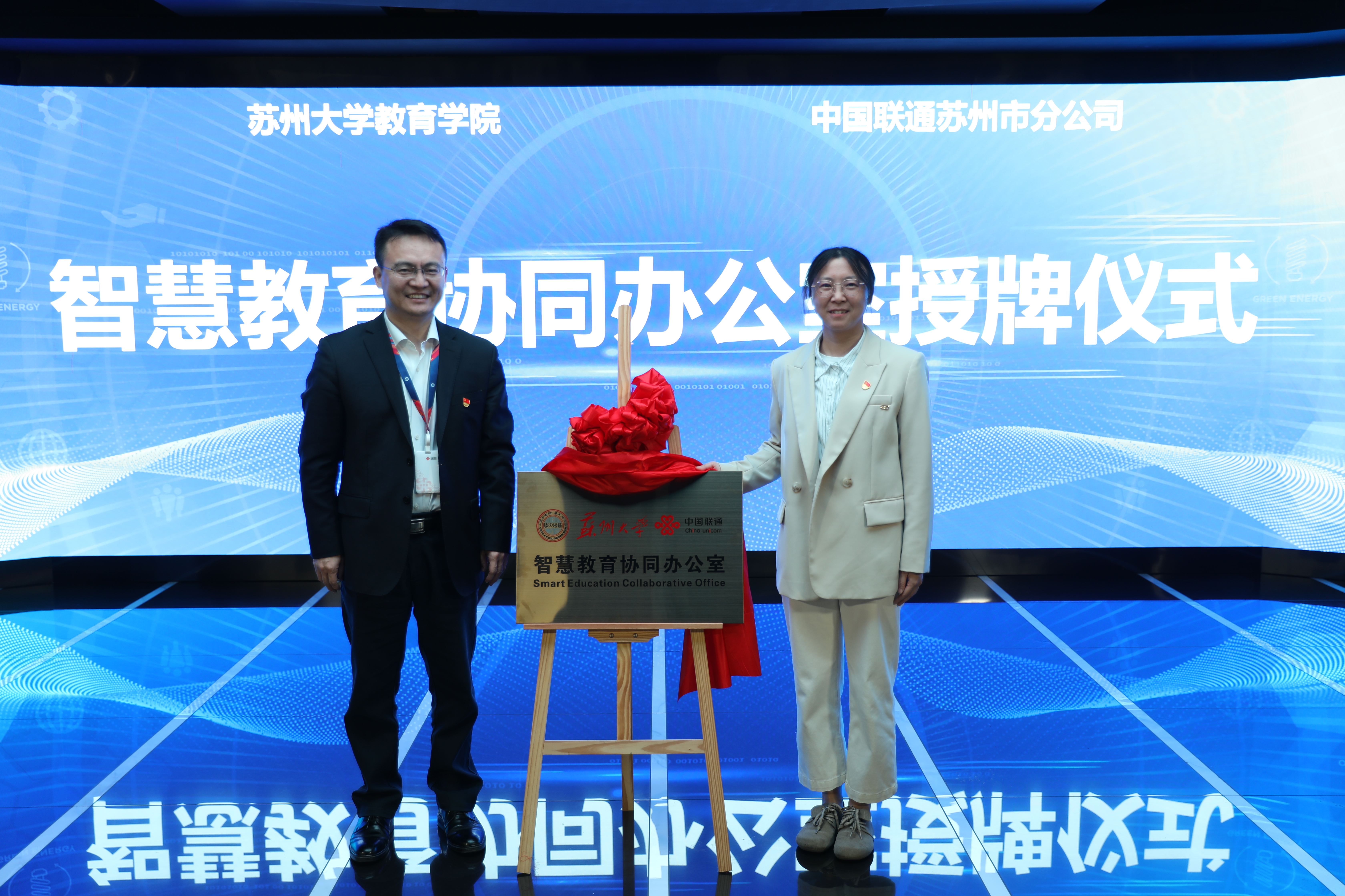 在与会嘉宾的共同见证下,苏州大学教育学院党委副书记朱晨花与苏州联通徐伟斌高级总监签署党建共建协议,副院长曹永国与苏州联通副总经理王筱签署战略合作协议。随后,宋清华书记为苏州联通授牌“智慧教育实践基地”,穆世军书记为教育学院授牌“智慧教育协同办公室”,标志着双方合作进入实质性推进阶段。