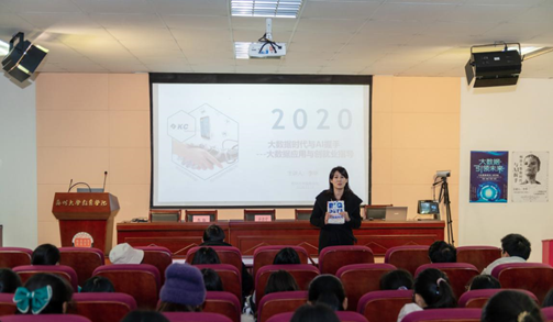 苏州开创软件有限公司特意在会场架设了自主研发利用动态人像技术、语音识别技术的人工智能应用实例环境----智慧安防、AR+城市盾牌、汉语教育学习平台。安装在门口的摄像机记录了每一位学生在经过摄像机时留下的影像并展示在大屏幕上。这突如其来的“视觉暂留”让同学们瞠目结舌,也在好奇的期待中拉开了讲座的序幕。首先,付老师从大数据时代的三个变化入手,为大家分析了本书的框架:大数据时代的思维变革、大数据时代的商业变革和大数据时代的管理变革。同学们了解到大数据时代更关注了数据间的相关关系而非因果关系,而这种数据间的相关关系,正是大数据能准确预测的关键原因之一。