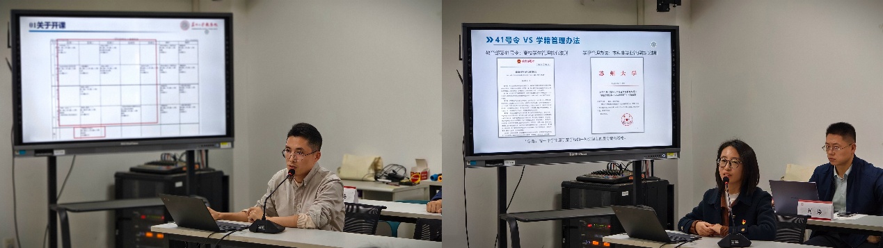 政策解读环节,教务处教务管理科科长沈晓卫就教学运行全过程展开系统讲解,内容覆盖课程修读、考试安排、教学资源使用等学生普遍关注的教学环节,并对选课操作、成绩管理、学业预警等具体政策进行了细致说明;“用好规则才能做好自我规划”,学籍管理科科长胡小琳以“用好规则 自我服务”为主题,围绕学籍管理、转专业政策、毕业审核与学位授予等关键事项,结合最新修订的相关文件,通过实际案例进行深入浅出的解析,帮助同学们全面把握学业管理的重要节点与政策要求。