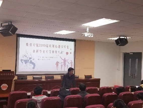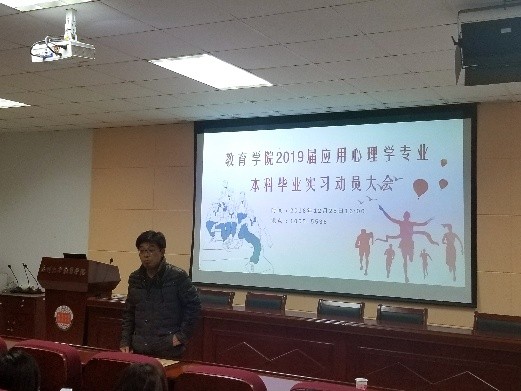 2018年12月25日下午16:00,我院在学院学术报告厅召开2019届应用心理学专业本科毕业实习动员大会。教育学院心理学系主任周成军老师、2019届应用心理学专业全体毕业生出席了本次会议。