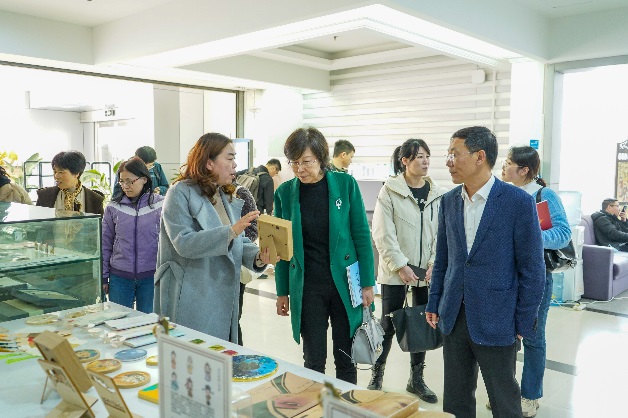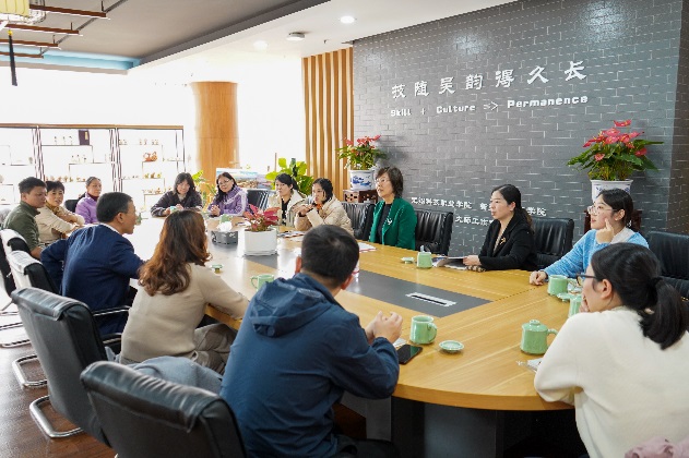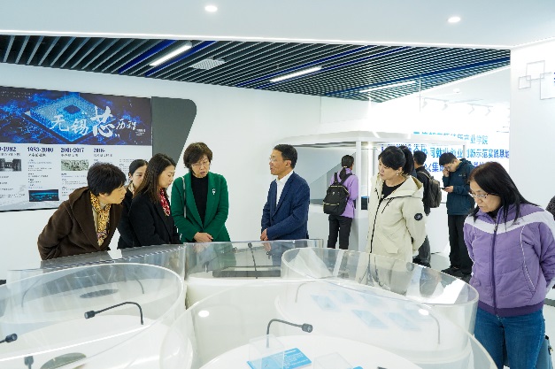 无锡科技职业学院党委书记张国华介绍了无锡科技职业学院建校20年以来的发展情况,包括学科建设、人才培养等内容。陪同参观了非遗文化节暨课程实践成果展、全国高校首个“学习强国”线下体验馆、工信部校企协同就业创业创新示范实践基地——新货集成电路实训基地等。