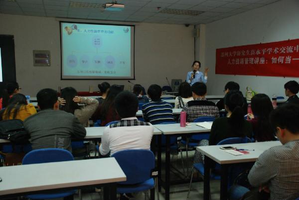 本次讲座属于苏州大学研究生高水平学术交流中心学术活动项目。中午1点讲座正式开始。首先,陈羿君教授向大家详细介绍了人力资源管理部门的构成和基本任务,强调了人力资源管理部门对整个组织的重要作用。接着,根据问卷调查的研究报告,陈教授就大学生普遍想要了解的问题、有关学业、前途发展以及人力资源管理现状的最新资讯向大家进行了分享。