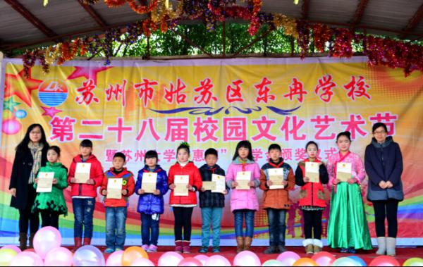 2014年12月30日上午,苏州市姑苏区东冉学校第二十八届校园文化艺术节暨苏州大学“惠寒”奖学金颁奖仪式隆重举行。校团委副书记朱今,东冉学校校长张传立,教育学院团委书记陈贝贝、教育学院学工办副主任杨炯以及东冉学校师生、教育学院本科生代表出席本次活动。