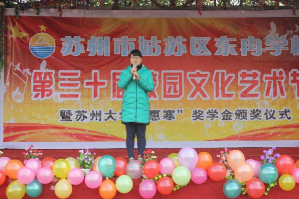 2015年12月29日上午,苏州市姑苏区东冉学校第三十届校园文化艺术节暨苏州大学“惠寒”奖学金颁奖仪式隆重举行。我院副院长张芸、团委书记陈贝贝,东冉学校校长张传立,东冉学校全体师生、家长代表和我院本科生代表出席了本次活动。