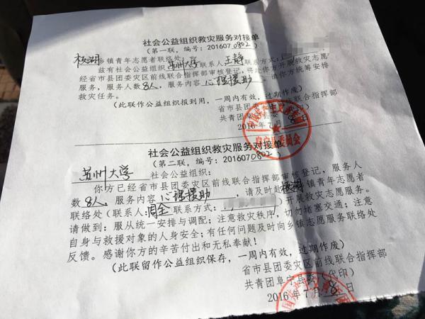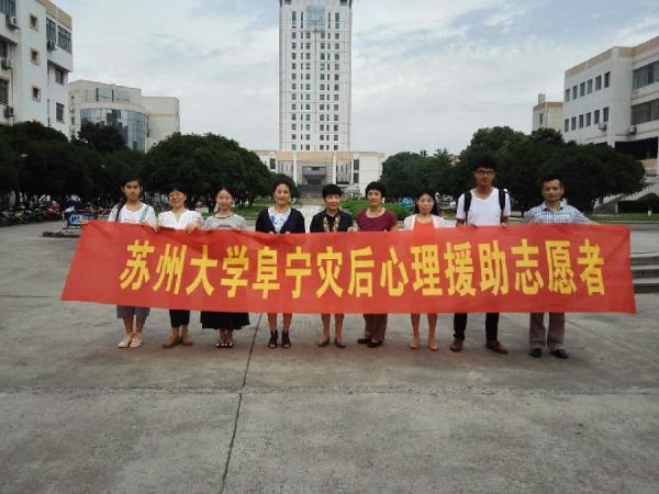 2016年7月8日下午3时,苏州大学第一批心理援助志愿者到达阜宁。此次志愿者团队由苏州大学大学生心理健康教育研究中心办公室副主任王静老师带领,由教育学院研究生会志愿者服务团的志愿者章旭、宋春晓、张晓晓、冯文来组成。在与阜宁团县委书记施宁琳进行了简单的沟通后,志愿者团队马不停蹄地赶到任务地点——板湖镇,与该镇政府统战委员孙晓、镇团委周全进行对接,了解灾区的情况,下午5时,在镇政府两位工作人员的带领下,志愿者团队到达板湖镇安置点——阜宁板湖中心小学开始志愿服务工作。