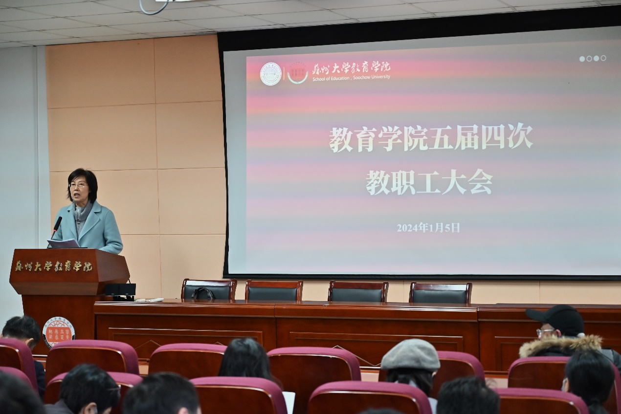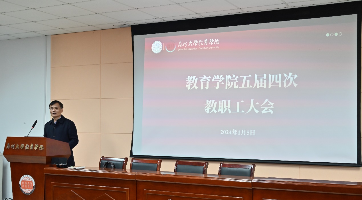 2024年1月5日下午,教育学院于1005-5536报告厅召开教育学院五届四次教职工大会。教育学院全体教职工参会,大会由党委书记赵阳主持。会议伊始,赵阳书记向全体教职工表达了新年祝福并介绍了大会议程。