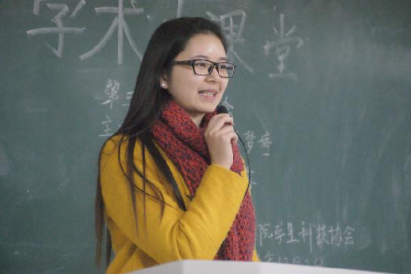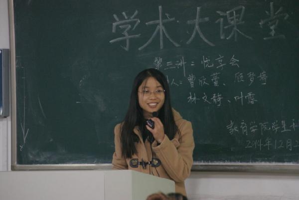 2014年12月2日晚18:30,由苏州大学教育学院学生科技协会主办的“学术大课堂”第三讲于文综楼1003-3202顺利举行。本场讲座邀请到教育学院11级应用心理学曹欣蕾、11级教育技术学顾梦婷、11级应用心理学林文静和11级教育学叶露四位顺利保研的同学针对学习经验、保研经历等话题与学弟学妹进行交流。参加本次活动的有2014级全体学生,部分2013级学生。