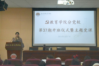 2021年3月17日,教育学院分党校第37期培训班开班典礼暨主题党课在教育学院学术报告厅举行。院党委副书记、副院长朱晨花,教育学院退休教师阎力,辅导员金利妍出席了开班典礼,学院87名入党积极分子、发展对象和预备党员参加了本次培训。