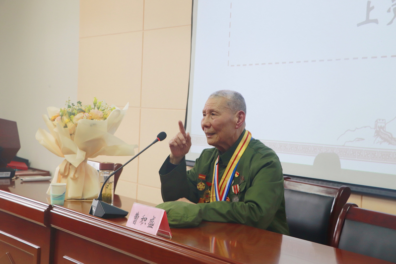 抗战老兵曹积盛年过九旬,却精神矍铄,目光如炬,1945年,年仅15岁的曹积盛在山东烟台参加革命,成为一名八路军小战士,参加过孟良崮战役、济南战役、淮海战役、抗美援朝战争,数次被炮弹弹片击中,身负重伤,最后九死一生回到祖国。曹老1947年加入中国共产党,作为一名党龄超过七十岁的老党员,曹老无论走的再远,仍不忘来时路。曹老回顾了中国共产党的百年历程,分享了他的峥嵘岁月和初心故事,带领大家重温了那段可歌可泣的烽火岁月。他声情并茂地讲述着自己作为老党员老战士几十年来所经历的、所参与的、所见证的历史,感叹革命胜利来之不易,更感叹如今和平幸福、国泰民安的珍贵。他表示学习百年党史是一种传承。中共党员要时刻严以律己,重视规矩,约束行为,做到心中有信仰,肩上有担当,脚下有力量。回望党史源头,才能更好地汲取信仰力量,传承红色基因,践行初心使命。