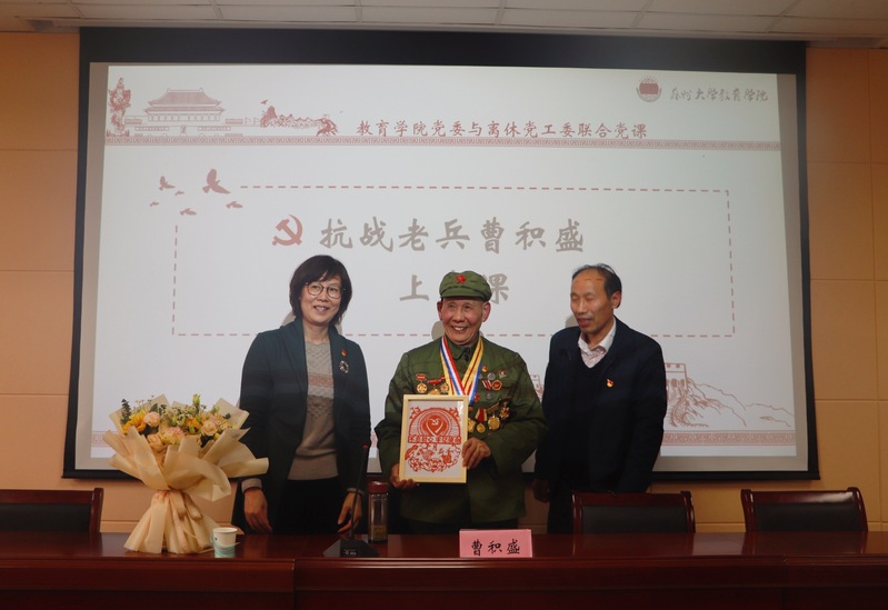 为传承红色基因、弘扬革命精神、铭记光荣历史,将党史学习教育引向深入,2021年4月16日,教育学院党委与离休党工委联合举办“铭记百年党史,传承红色基因”专题党课。本次党课特邀抗战老兵曹积盛讲述党史故事,教育学院党委书记赵阳、离休党工委书记、离退休工作部(处)部(处)长余宏明、离休党工委在职党支部党员、教育学院教师党员、预备党员、入党积极分子聆听了党课。