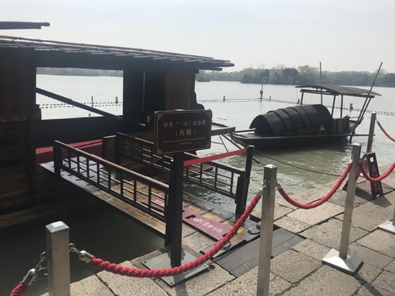 为了纪念中共“一大”在南湖游船上胜利闭幕这一历史事件,在中央和省委指示下,1959年仿制了一条当年“一大”开会的游船,作为“一大”会议纪念船,停泊在烟雨楼前水面上。这条“一大”纪念船也因此被称之为“南湖红船”。教育学院的老师们在导游的带领下,乘船来到湖心岛,在“南湖红船”前瞻仰革命圣地,回忆历史,感受“红船精神”。