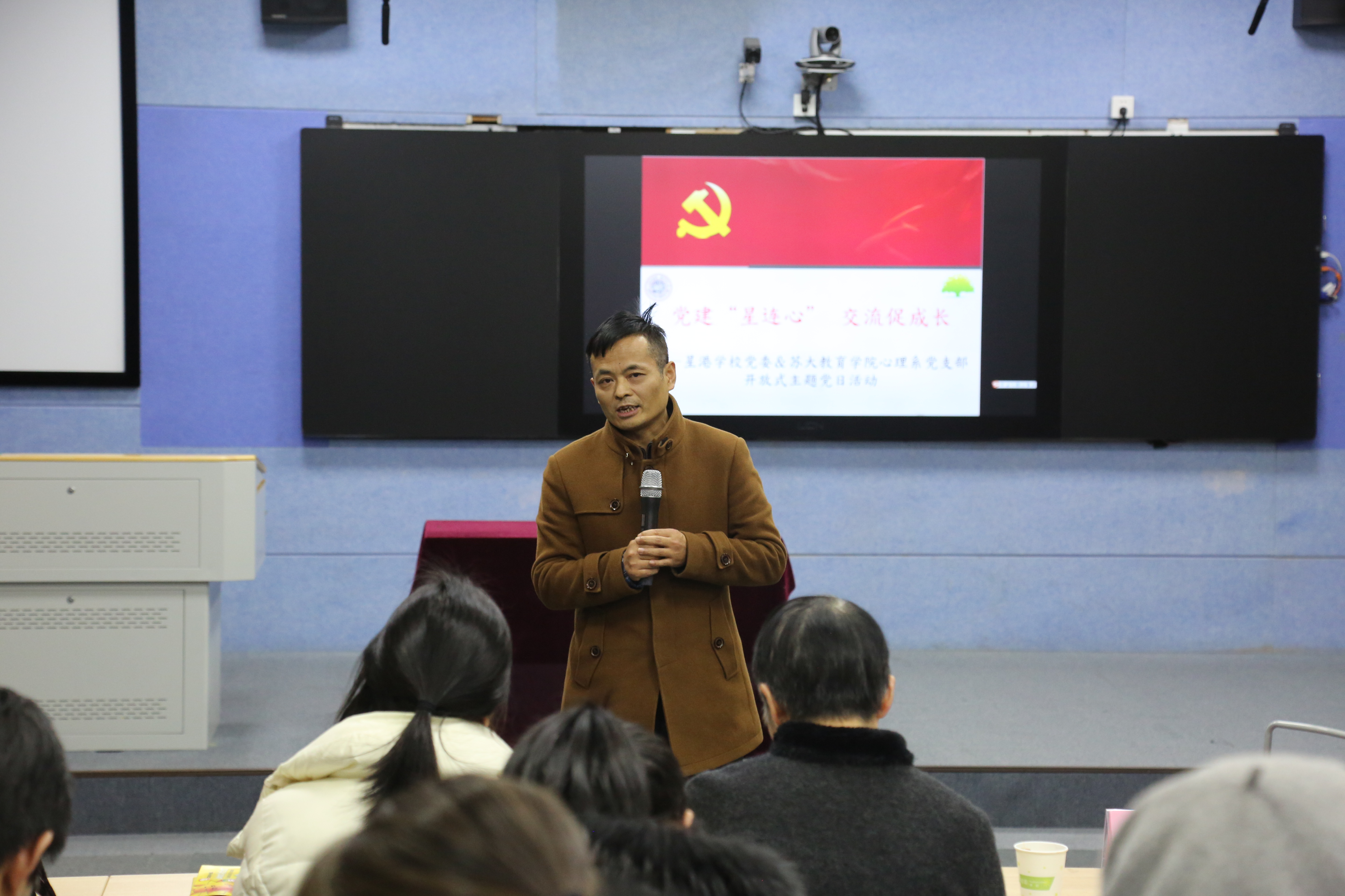 活动最后,身为直接负责联系心理学系党支部的学院领导,苏大教育学院院长冯成志教授介绍了党建工作经验。2018年12月,心理学系党支部成功入选教育部“全国党建工作样板支部”培育创建单位。党建工作扎实有效、活动丰富、深入基层,起到了良好的示范榜样作用。冯院长充分肯定了今天活动的形式和效果,双方共同学习交流,进一步强化了基层党建合力。他表示要将两家单位的党建联盟更加深入、常态化地推进下去。