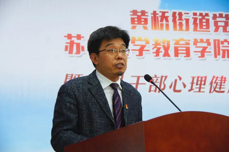 胡玉庆以《党建共建携手浇灌心理关爱的向阳之花》为主题发表讲话。他指出,党建共建能进一步整合地校基层党建资源,拓展和提升合作内涵,实现资源配置优化、组织效能强化;双方联盟能进一步拓展基层党建的工作模式,通过党建共建使基层党建跳出内循环式的工作模式,在功能上实现相互扩展和相互融通;领导干部心理健康关爱“向阳花工程”,能充分发挥教育学院的师资力量,为黄桥街道打造健康型干部队伍。