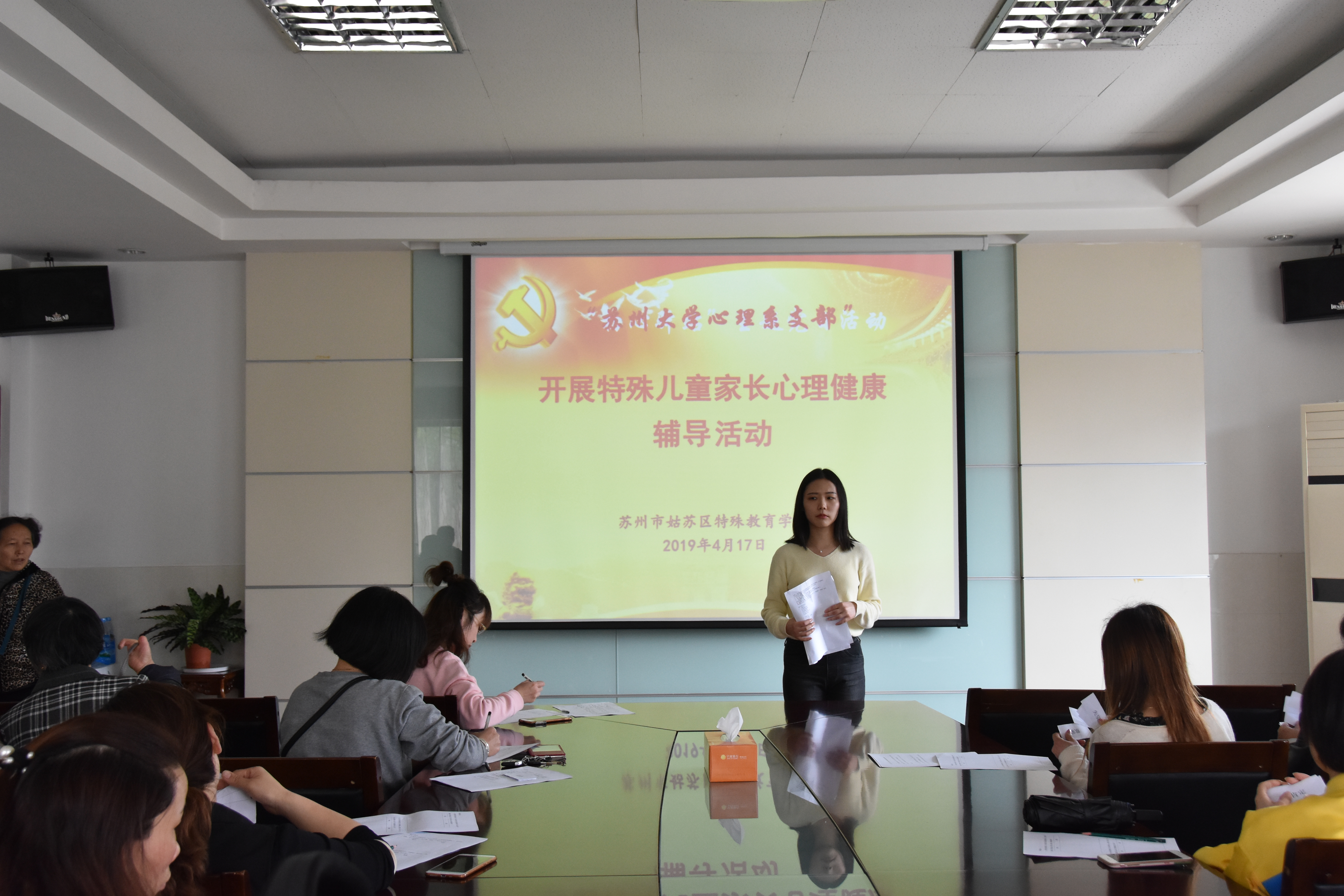 4月17日下午,由苏州大学心理系支部组织的特殊儿童家长心理健康辅导活动在苏州市姑苏区特殊教育学校顺利举行。