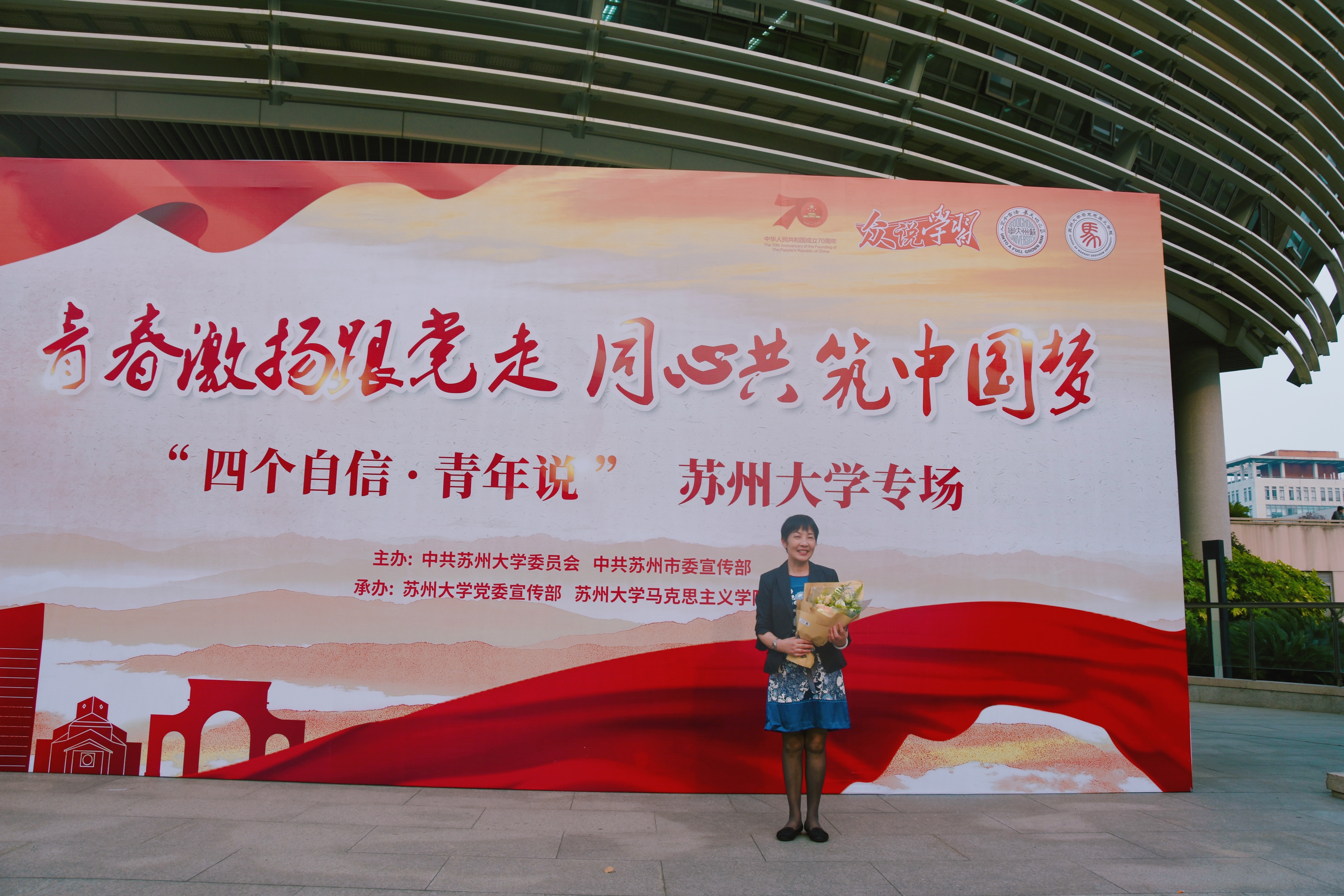 9月25日下午,苏大教育学院心理系黄辛隐教授参加了以“青春激扬跟党走,同心共筑中国梦”为主题的苏州大学“四个自信”·青年说活动。本次活动由中共苏州大学委员会和中共苏州市委宣传部共同主办,全校共计有两百余名师生参加。活动分设爱国情、强国志、报国行三个篇章,师生代表以演讲、情景剧及诗朗诵等多种形式抒爱国之情,道强国之志,立昂首奋进、报效祖国之心。