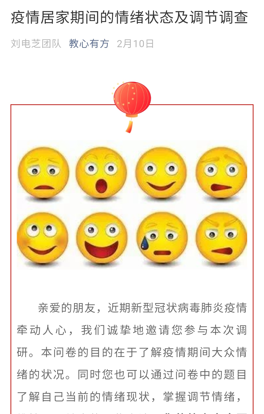 刘电芝教授领导的团队自编了“疫情居家期间的情绪状态及调节调查”问卷,回收1528份问卷。苏州市心理学会王平秘书长编制,刘电芝教授修订完成了苏州大学学生应对疫情需求的问卷,回收问卷1651份以上。