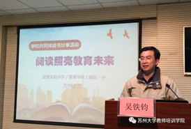 2019年2月27日,星海实验中学、星港学校、园区一中三校共同体青年教师读书交流活动在园区一中五楼会议室举行。活动由园区一中教师发展中心主任王秀荣主持。苏州大学教育学院副院长吴铁钧,教育学院心理系党支部党员周成军参加了活动。
