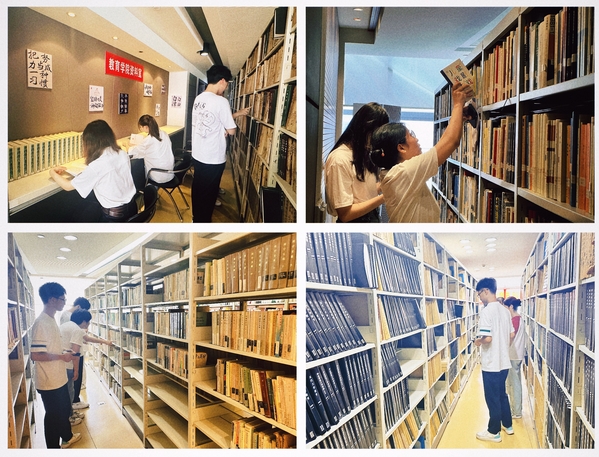 接力赛场地位于教育学院资料室,活动伊始,由管理员带领党员们参观并熟悉资料室每方寸阁间的藏书,满满匝匝的书群里弥散着扎扎实实的学术味。党员们翻阅着党纪学习教育相关书籍,在沉浸式的学习空间中积极地交流互动。