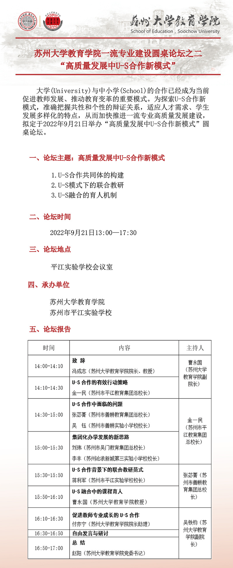 苏州大学教育学院一流专业建设圆桌论坛之二 “高质量发展中U-S合作新模式”[9.21]