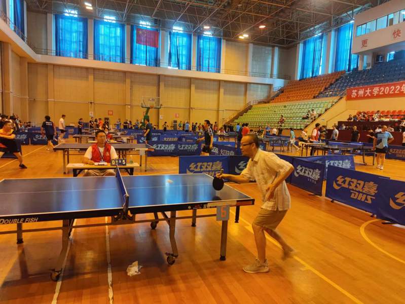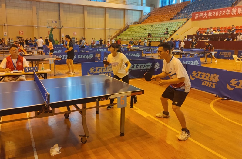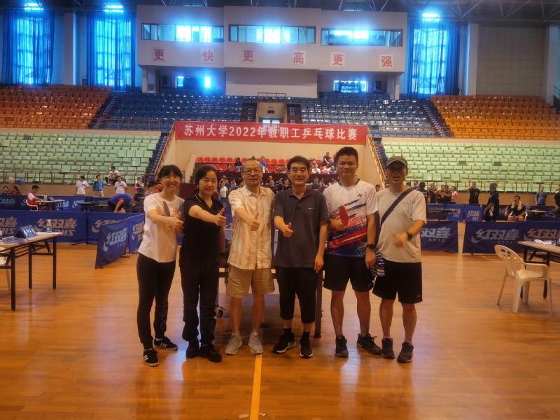 9月17日,2022年苏州大学教职工乒乓球赛在东校区体育馆举行,我院教工乒乓球队齐心协力,团结一致,奋力拼搏,最终以小组第二的成绩出线,跻身团体十六强。