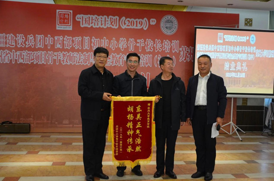本期培训的项目设计、课程实施和班级管理工作得到了参训校长们高度认可。参训校长们向苏州大学教育学院赠送了“东吴正气浩然,胡杨精神传承”的锦旗,学员代表高峰江校长现场挥毫,创作了一副书法作品。