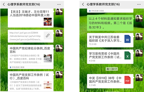 在召开组织生活会之前,支部书记丁芳就在党支部微信群中发了4个学习材料,包括《中国共产党纪律处分条例》《中国共产党支部工作条例(试行)》《王继才、王仕花等11人当选2018感动中国年度人物》和视频《孤岛32年》,供党员老师在进行学习。另外,根据学校党委《关于转发中共江苏省委组织部《关于深入学习宣传贯彻<中国共产党支部工作条例(试行)>的通知》,支部党员深入学习宣传贯彻条例。