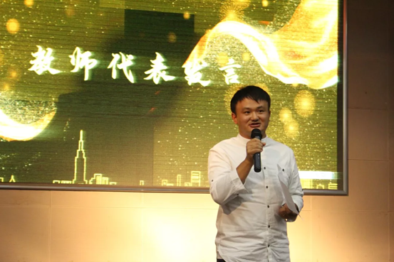 苏州大学教育学院王爱君老师作为教师代表之一致辞。他表达了对获得该荣誉的感谢,同时也分享了自己的教学体验和教育道路上心路历程,并提出了对未来的教育生涯目标和期望,他的发言获得了在场所有教师和学生的热烈掌声。