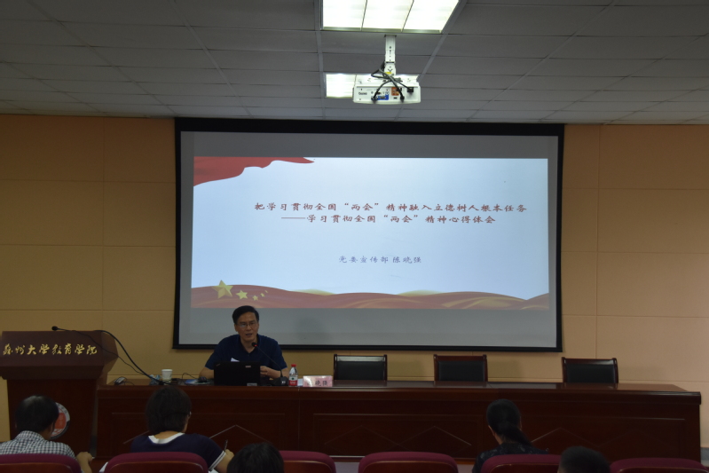 7月1日上午,教育学院在学院学术报告厅召开两会精神学习会,邀请了校党委常委、宣传部部长陈晓强作学习贯彻全国两会精神专题辅导报告。院党委理论学习中心组全体成员、各党支部书记、支部委员及学生骨干参加了学习。