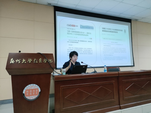 为更好的学习宣传贯彻党的二十大精神, 2022年11月9日下午,教育学院党委举办了学习宣传贯彻党的二十大精神专题辅导报告会,邀请了苏州大学马克思主义学院副院长朱蓉蓉教授作专题辅导。教育学院全体教师及部分学生党员参加了报告会。会议由学院党委书记赵阳主持。