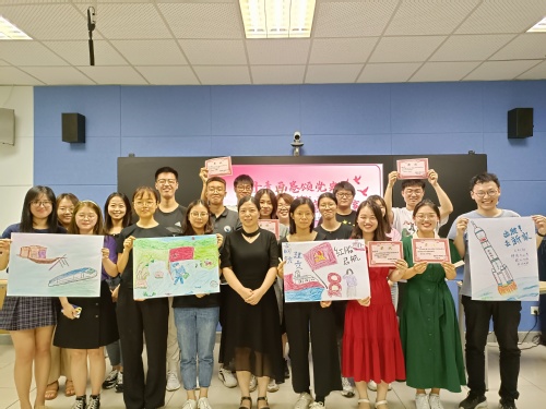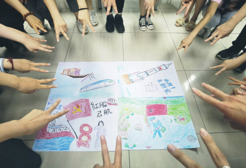 结合本支部心理学专业的特色——表达性艺术绘画,党员们根据《中国共产党百年述职报告》选定主题进行团体绘画,用纸和笔谱写这百年来辉煌的历史瞬间。从南湖的红船,到遍布全国的高铁,党从风雨中驶来,披满霞光,高速奔向远方。高举党旗跨过溪流草原,“一不怕苦、二不怕死”的长征精神伴随着一代又一代的共产党员向前。“神舟十二号向阳启航,直冲霄汉”,百年圆梦且看今朝!